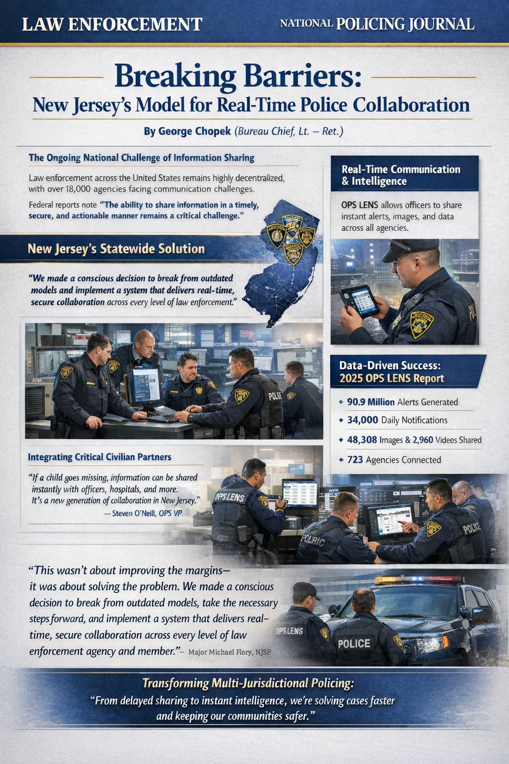 To address these challenges, the State of New Jersey, led by the New Jersey State Police (NJSP), decided to take a major step forward and implement an innovative approach to this national challenge, the statewide “Law Enforcement Notification and Sharing” platform (OPS LENS). In the summer of 2024, this secure law enforcement network directly connected, for the first time, all local, county, and state officers and agencies in real time, providing a unified framework for communication, intelligence sharing, and operational coordination.